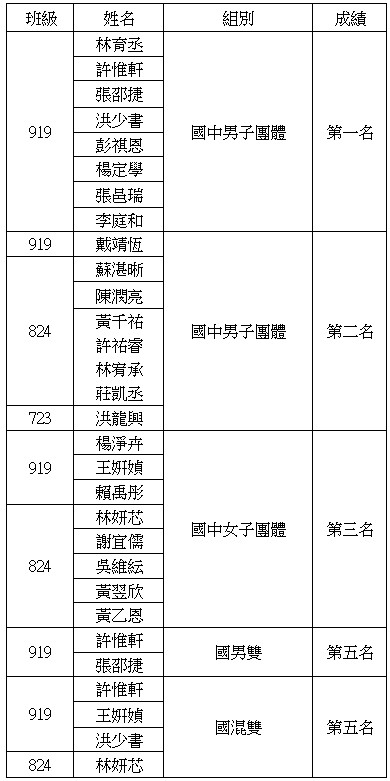 國男團體第一、二名、國女團體第三、第五名、國女雙打第二名、