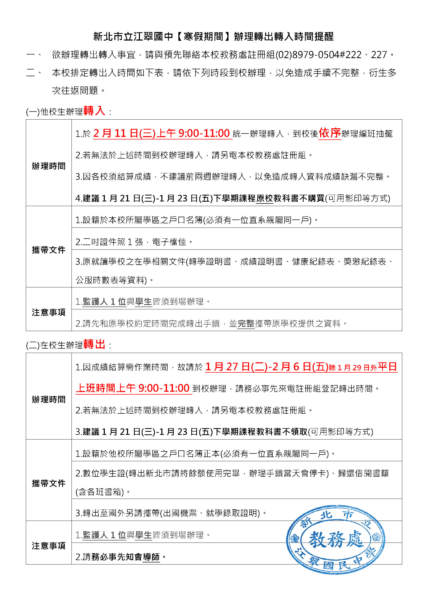 【公告】江翠國中寒假期間辦理轉出轉入時間說明